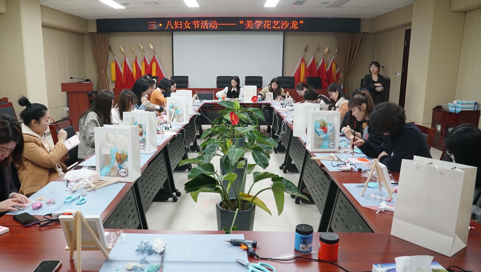 活动邀请了专业花艺师进行活动指导。活动伊始,花艺老师向大家介绍了油画的概念、油画绘画最基本的手法、永生花的花材养护和插花小技巧,对各种辅材的作用、使用方式和注意事项等进行了详细讲解,并结合理论知识进行现场作画示范。随后,女员工在花艺老师的指导下发挥想象力,施展作画技能,创意谋篇布局,结合不同的画布底色和花朵色彩,各显神通。随着时间的流逝,一件件清新淡雅、风格迥异的插画作品随即盛开在女职工的手中。活动尾声,女员工手捧鲜花与自己亲手绘制的插画作品合影留念,为节日增添了靓丽的色彩。