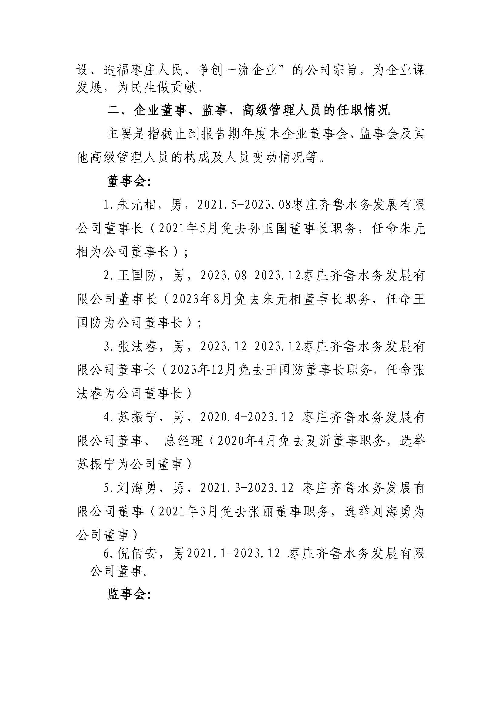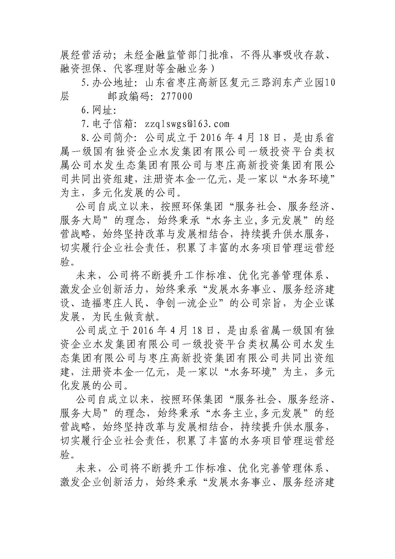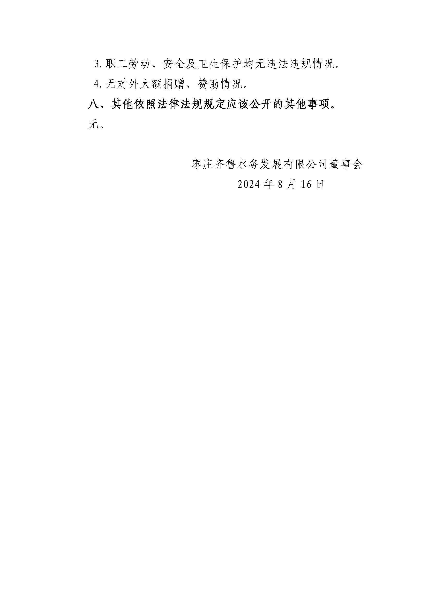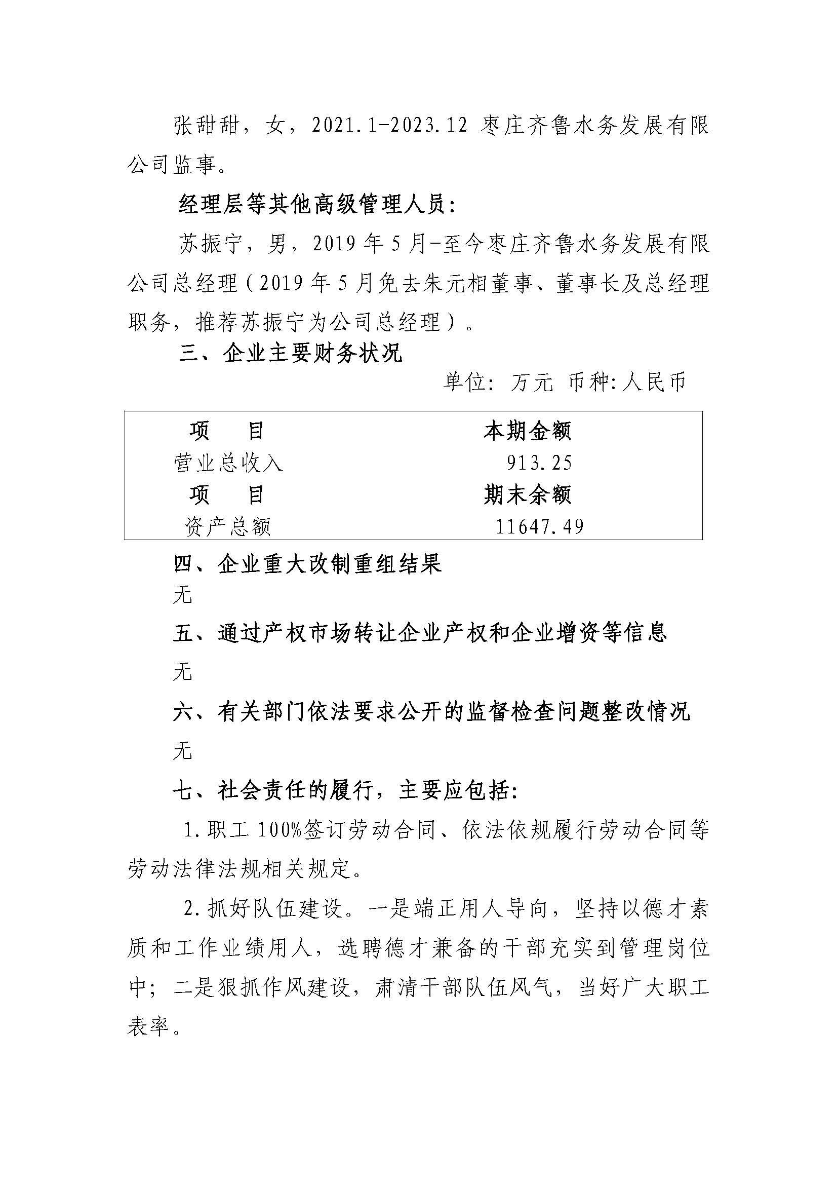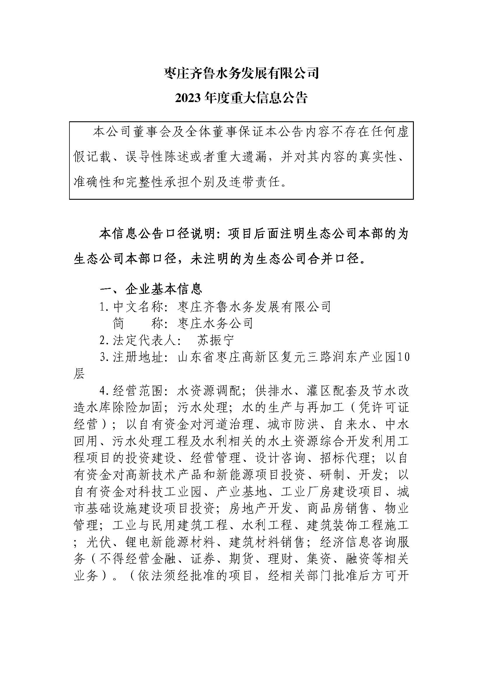 枣庄齐鲁水务发展有限公司 2023年度重大信息公告