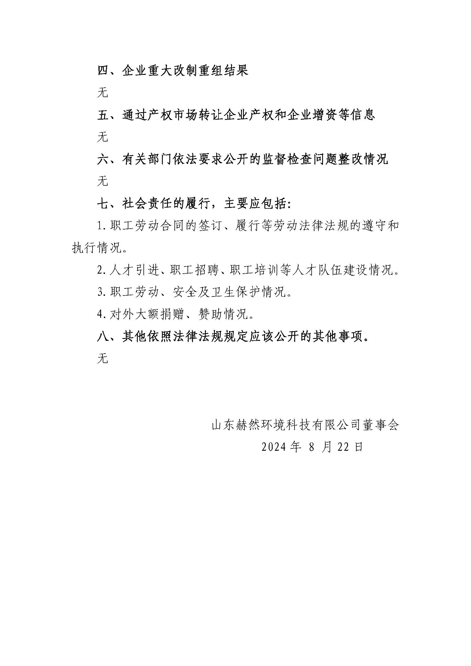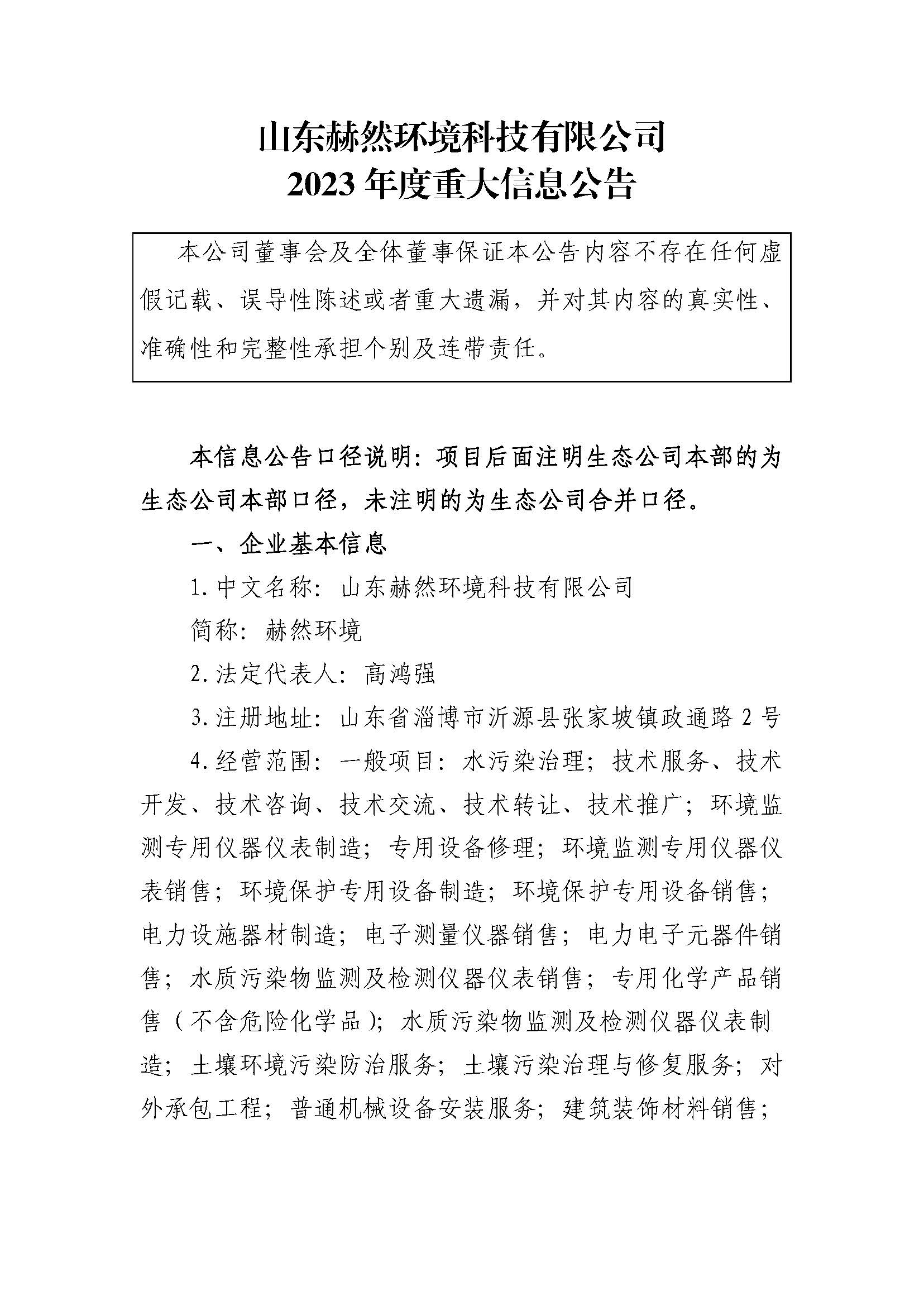 山东赫然环境科技有限公司2023年度重大信息公告