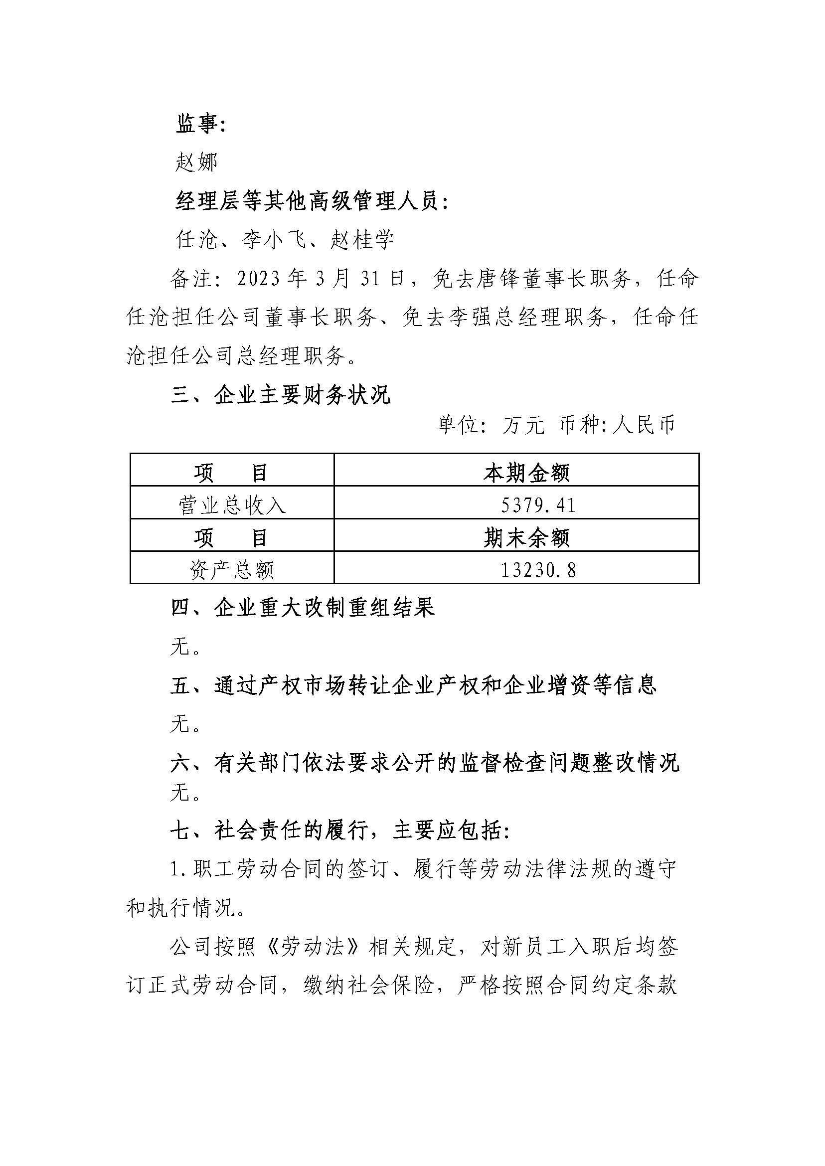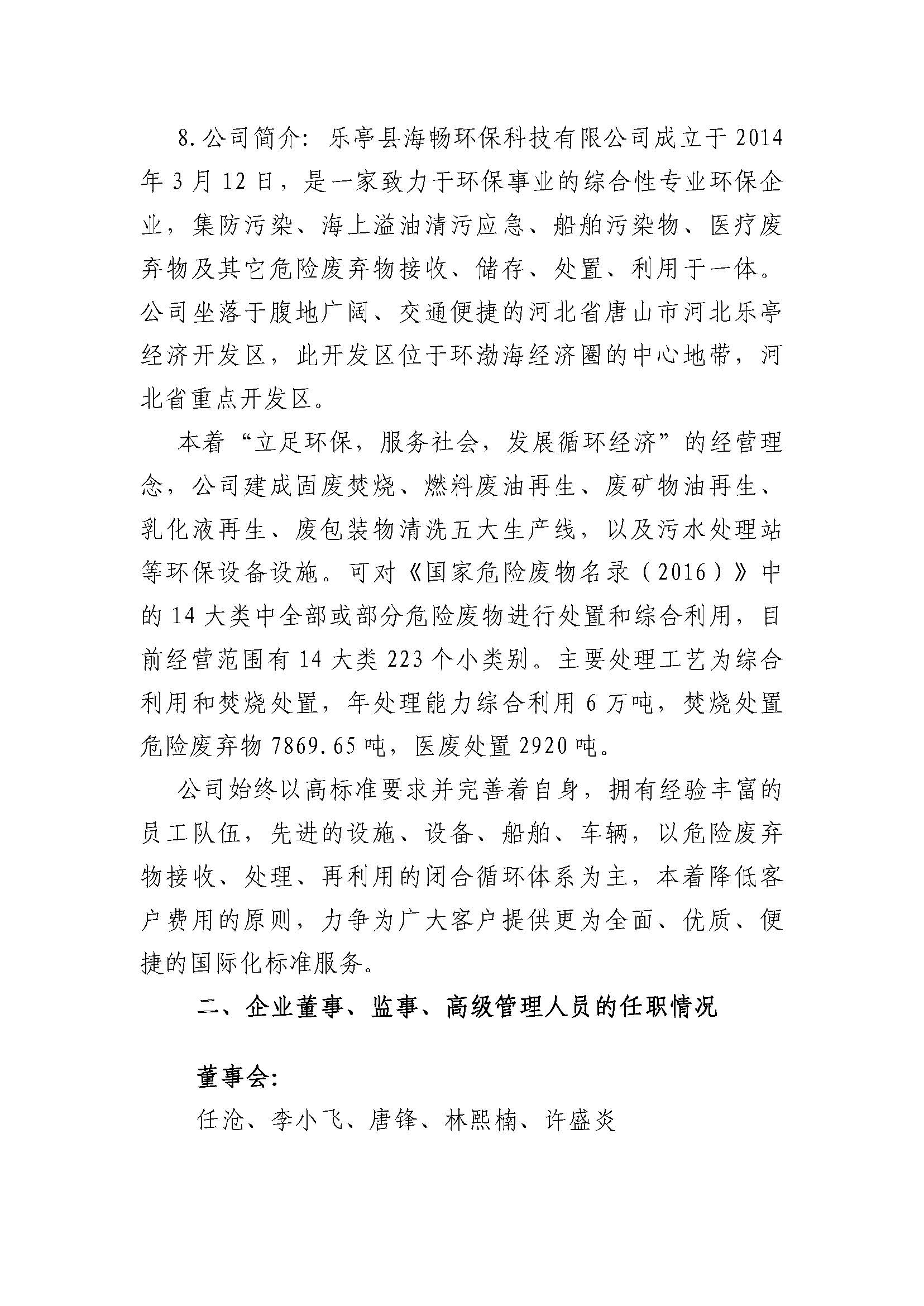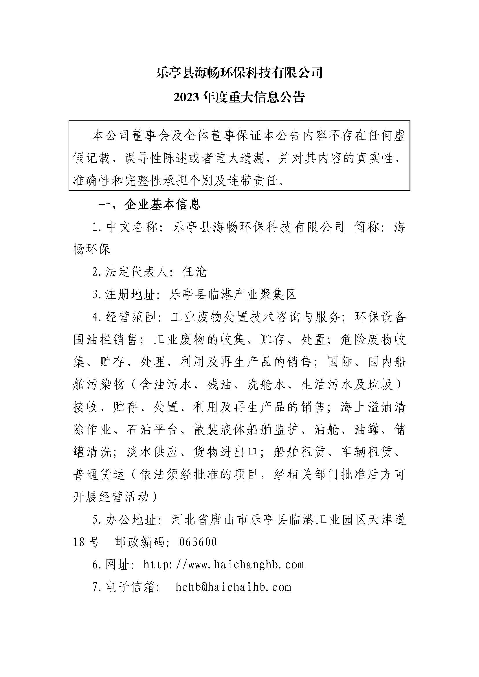 乐亭县海畅环保科技有限公司2023年度重大信息公告