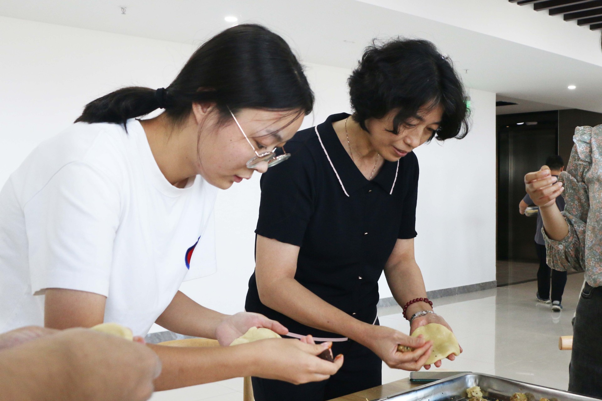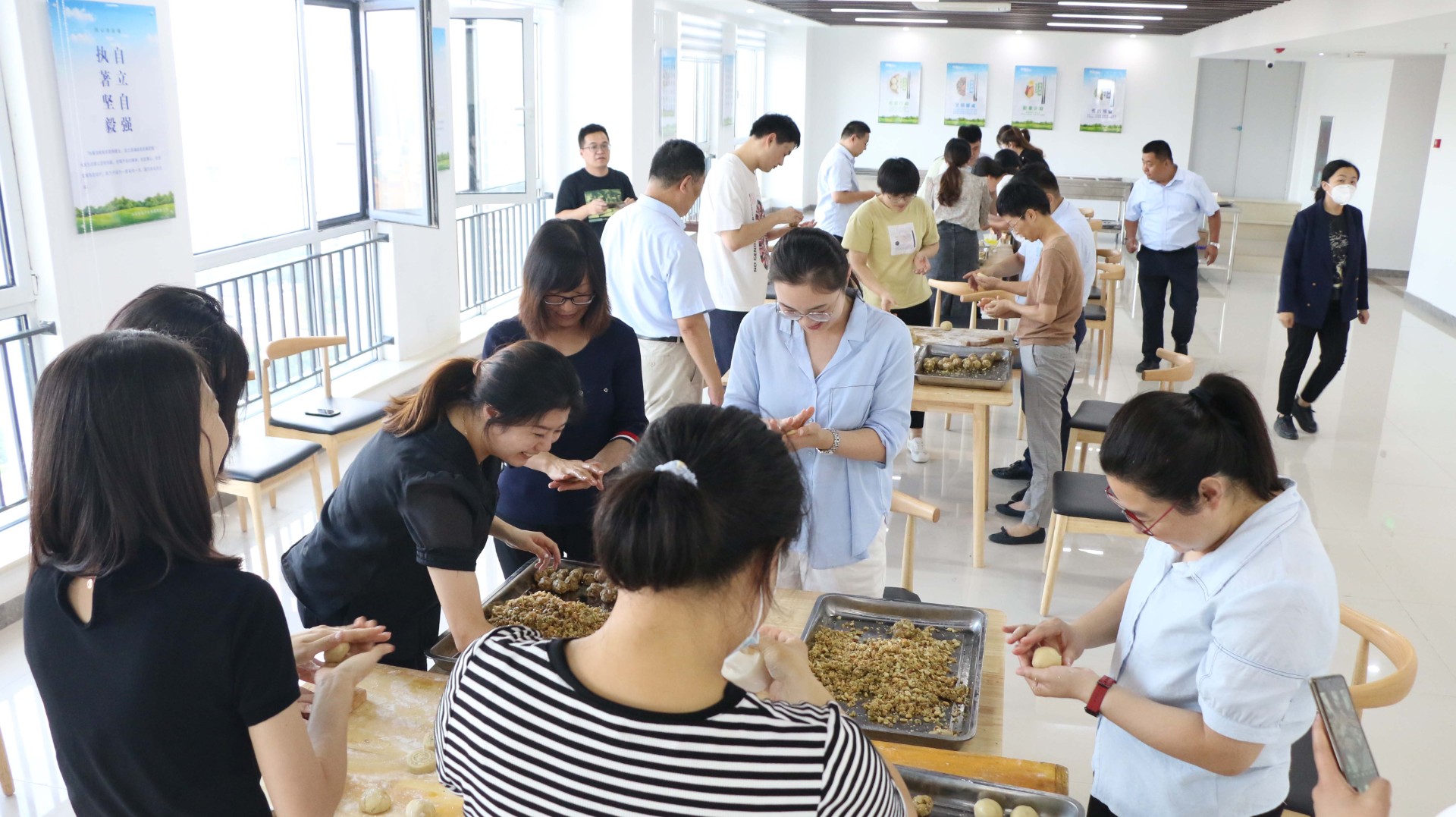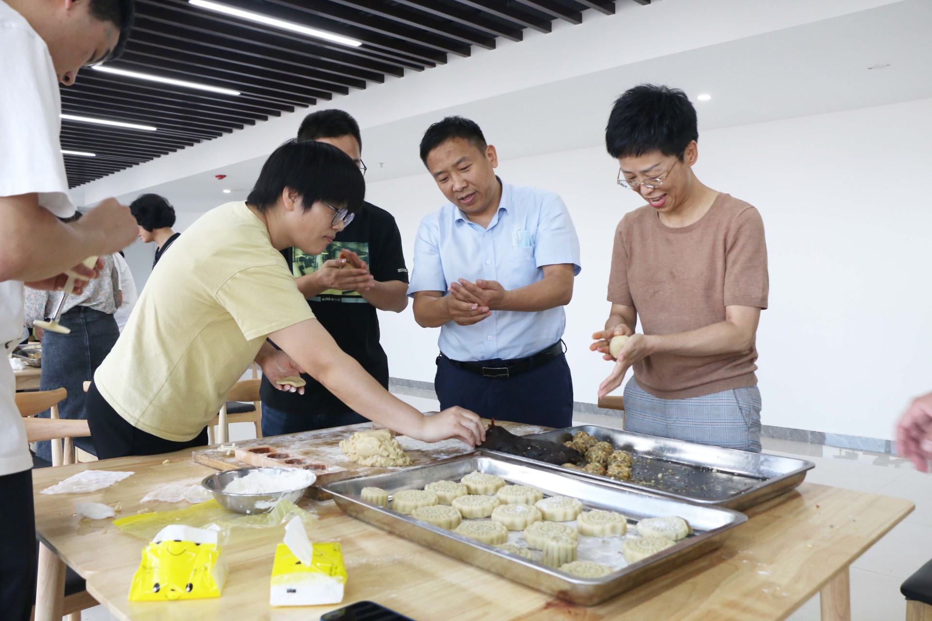 活动中员工亲手制作月饼,大家分工明确,揉面团、压皮、压模具依序进行,随后参加活动的各公司员工分别组成队伍展开月饼制作比赛,参赛选手纷纷拿出看家本领,舞动娴熟的巧手,亮出的自己的“绝活”,很快在大家的分工协作下,一个个图案多样、彰显中秋团圆之意的月饼在大家的巧手下完成,场面热闹,气氛融洽,最终经过评委评定,生态集团本部队伍获得比赛第一名。月饼烘烤完成后,大家拿着自己亲手制作的月饼进行合影留念,会场内洋溢着欢乐祥和的节日气氛。