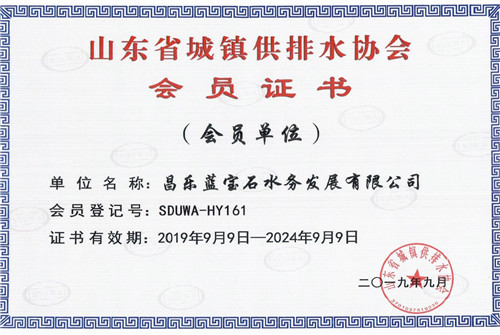 近日,昌乐蓝宝石水务发展有限公司荣获山东省城镇供排水协会颁发的会员证书,正式成为协会一员。标志着蓝宝石水务公司在探索与同行交流的步伐上迈出了坚实的一步,步入一个新的台阶,这是对昌乐蓝宝石水务发展有限公司在水处理行业工作中的肯定与支持,也是对公司全体工作人员未来的鼓励。